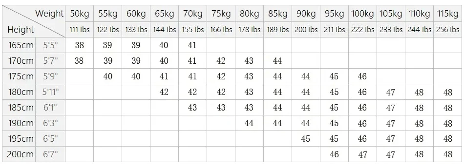 38 Asian size S, 39 Asian size M, 40 Asian size L, 41 Asian size XL, 42 Asian size 2XL, 43 Asian size 3XL, 44 Asian size 4XL, 45 Asian size 5XL, 46 Asian size 6XL, 47 Asian size 7XL