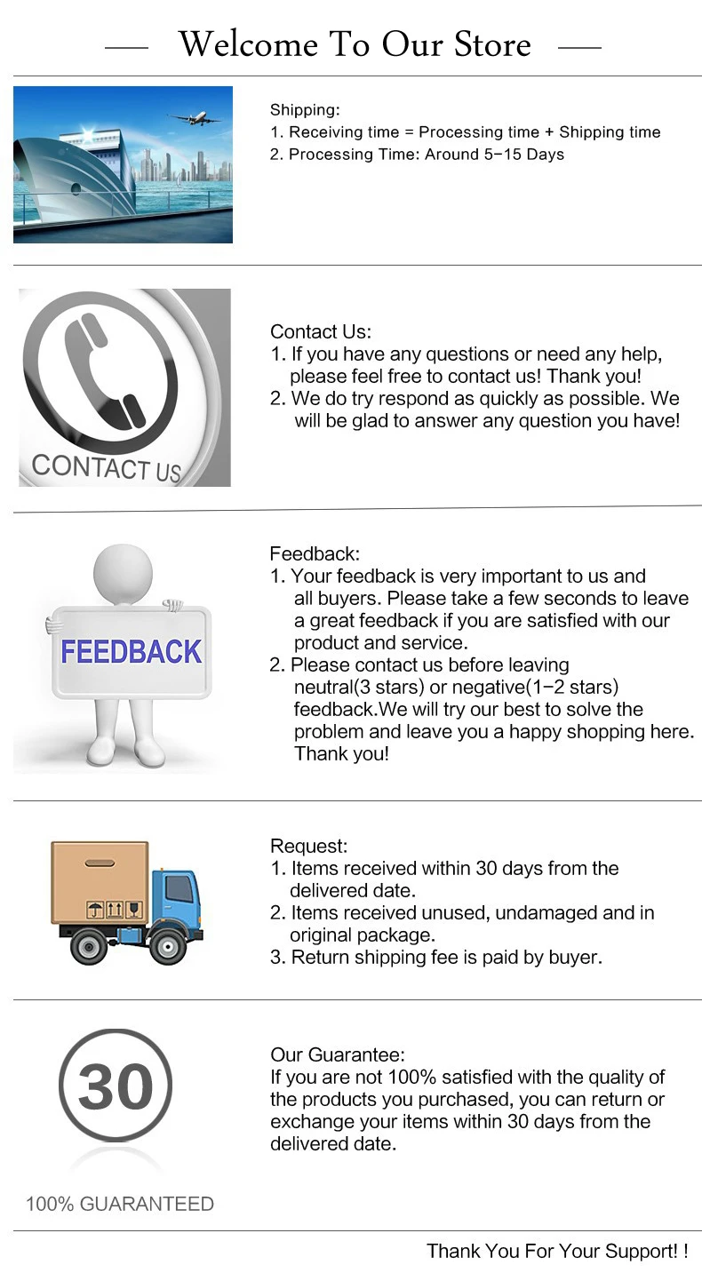 4. Normally we can send your order within 3 days after the payment, If not, please contact us to check the problem.