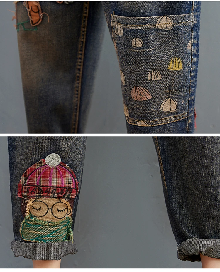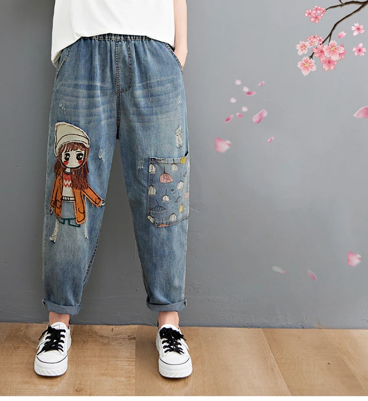Cartoon Embroidery Harem Denim Pants – Women’s High Waist