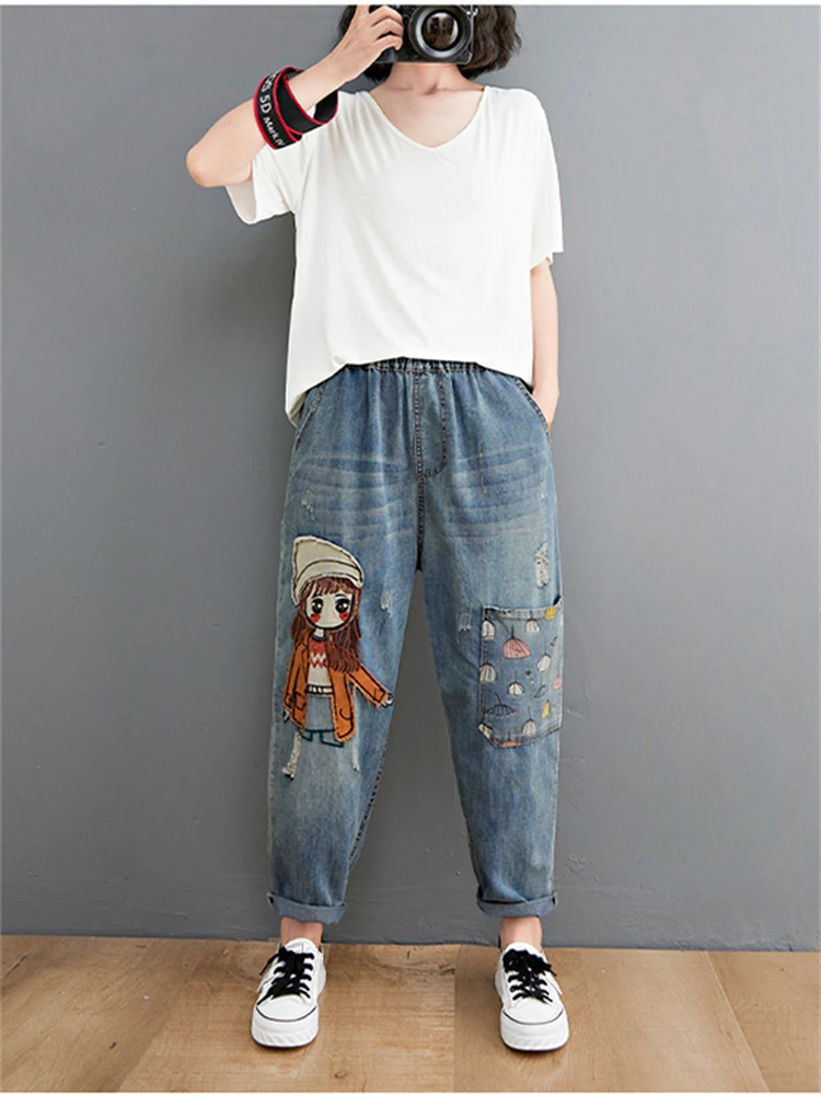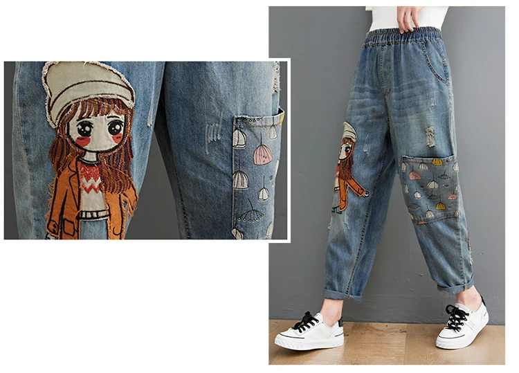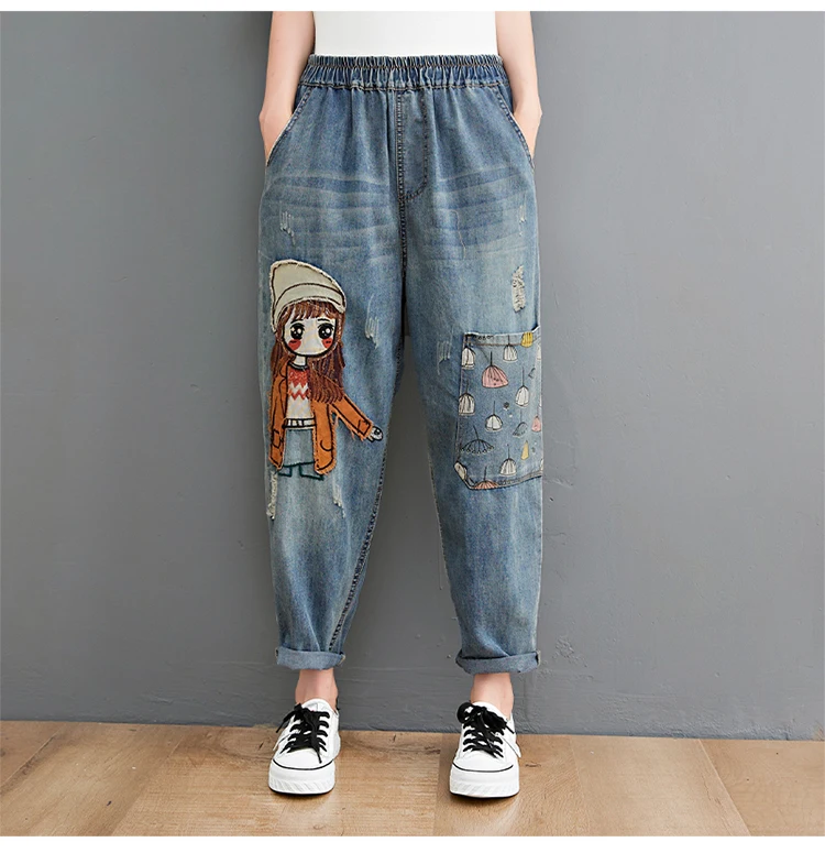 6537 Cartoon Litter Girl Embroidery Denim Pants For Women Trendy Hole Casual High Waist Breeches Pockets Mom Harem Blue Jeans LFFMHMT