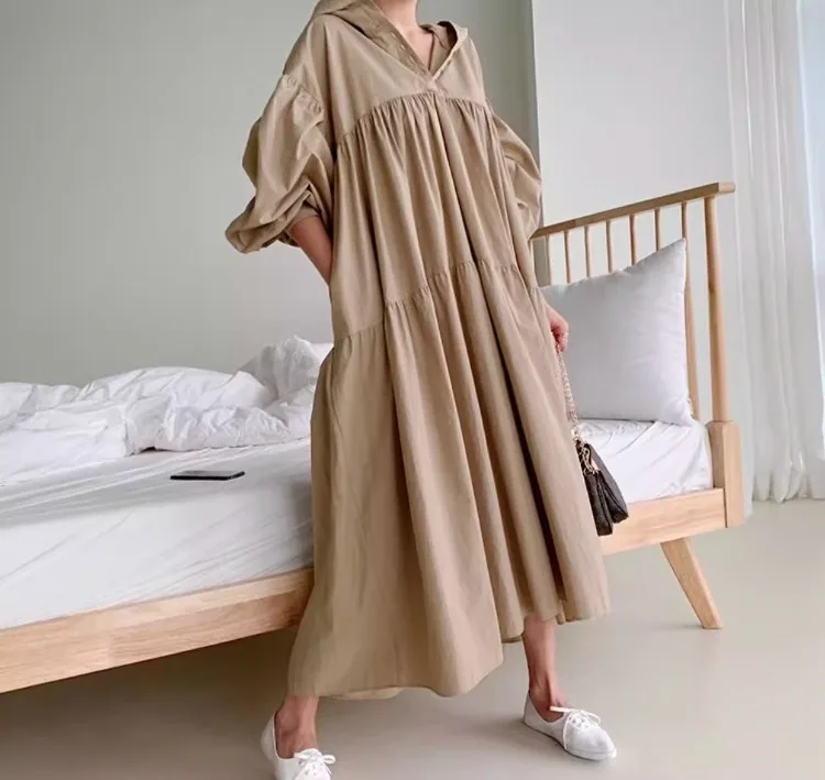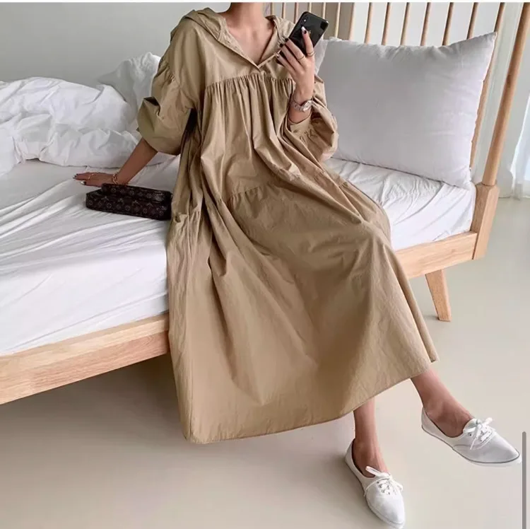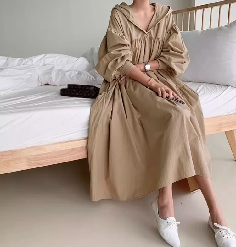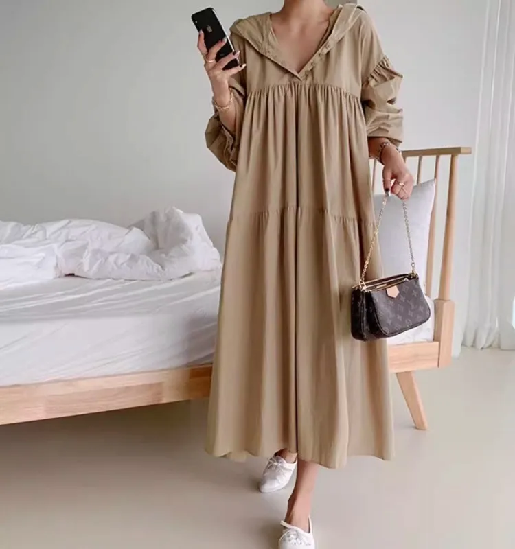 Women’s Hooded Cotton Linen A-Line Long Sleeve Dress