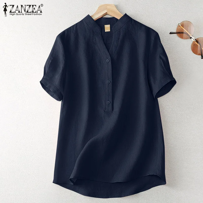 Elevate your summer wardrobe with the ZANZEA Women’s Elegant Cotton Short Sleeve Blouse, a stylish and comfortable top perfect for casual and semi-formal occasions. This blouse is crafted from 100% breathable cotton, making it soft, lightweight, and ideal for warm weather. Its durable cotton fabric ensures comfort all day, whether you are at home, at the office, or enjoying outdoor activities.